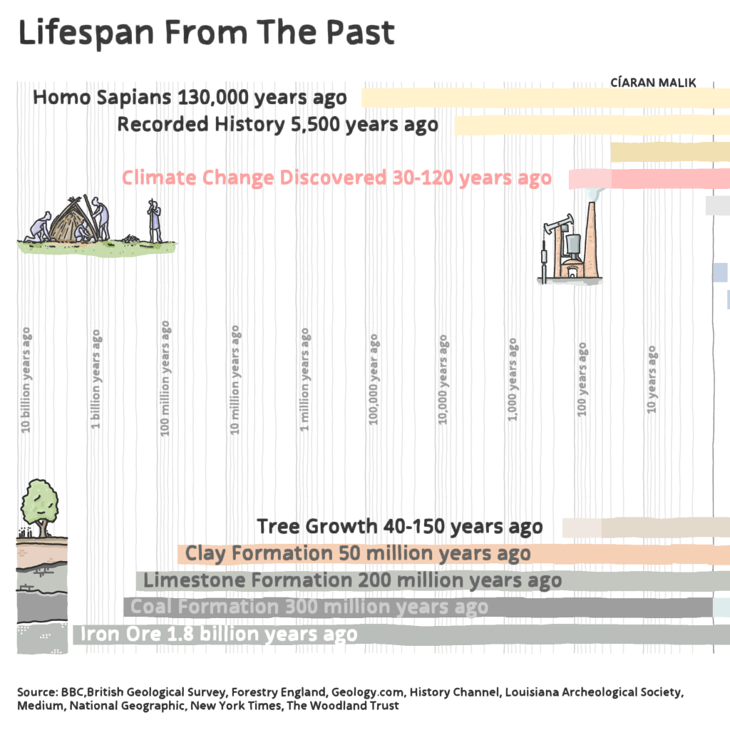 Looking backwards, I hadn’t appreciated just how different the time taken for materials to form is. Some have been created over millions or billions of years, while others grow in the same time that we’ve understood climate change.