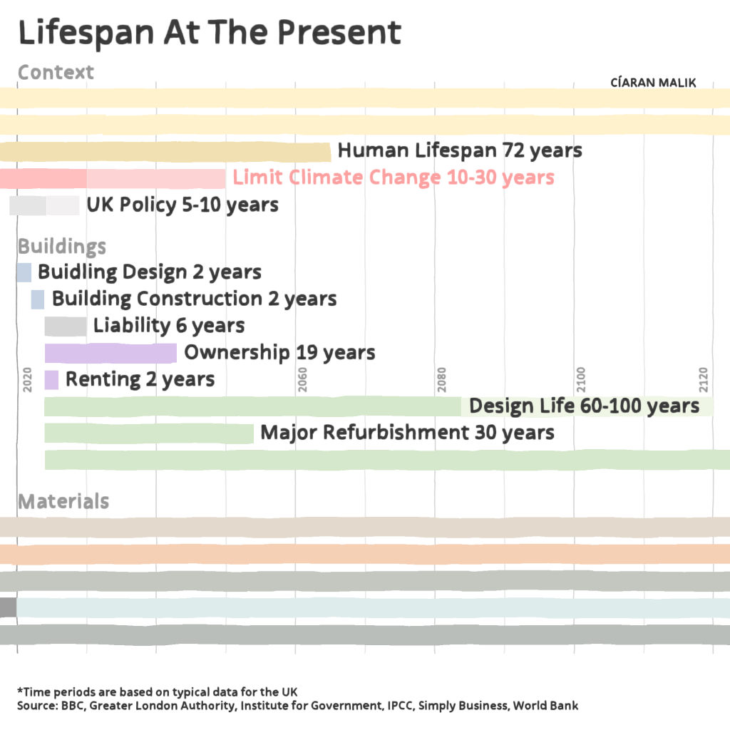 As designers we should understand the consequences of our actions on the future. Often it can be difficult to visualise the lifespan of our work in relation to climate change, the materials and our own lives. This diagram started from one of many conversations with Apparata in preparation for the Architecture Foundations 100 Day Studio presentation.