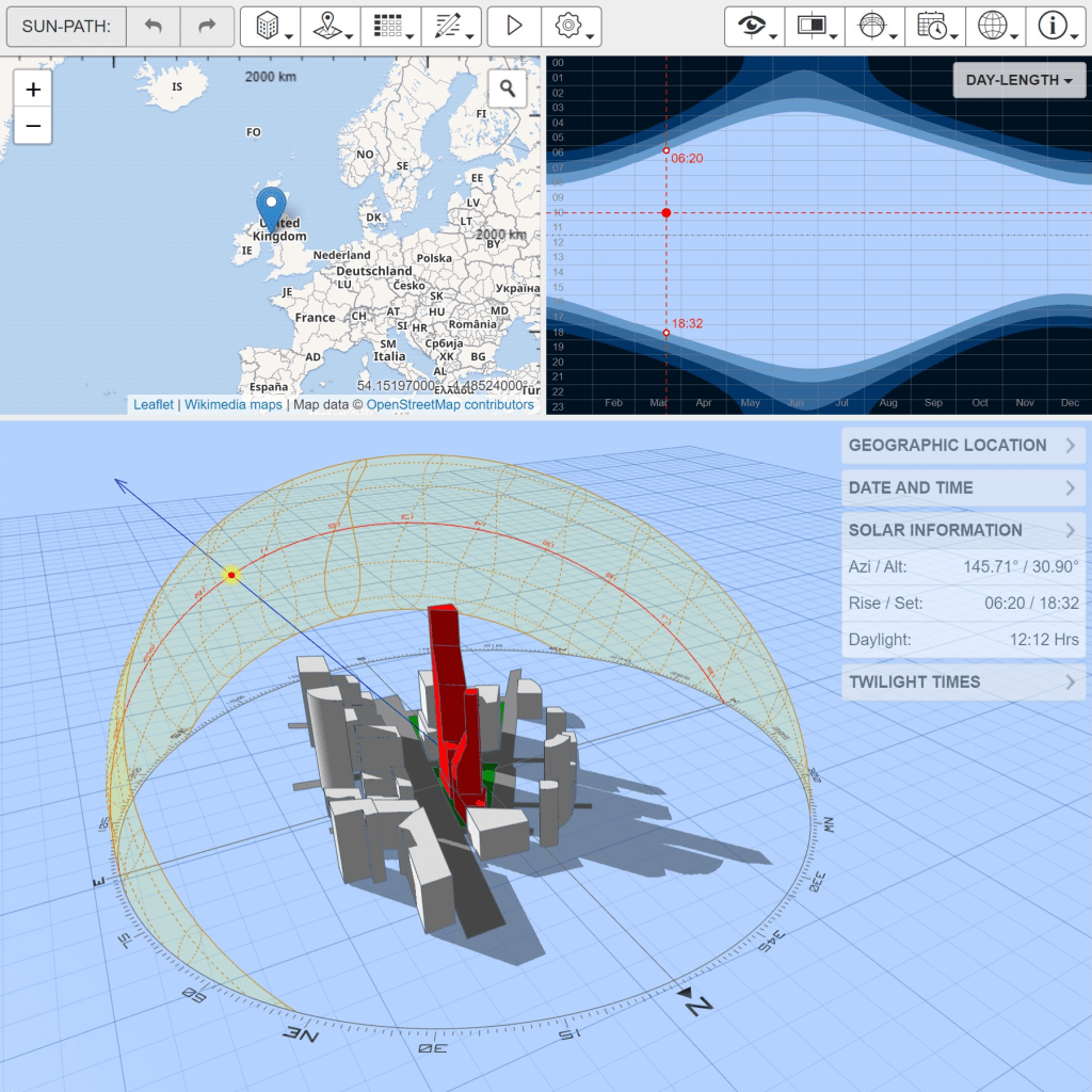 A tool to look at the sun path on a site, overshadowing at different times of year and the impact of obstructions.